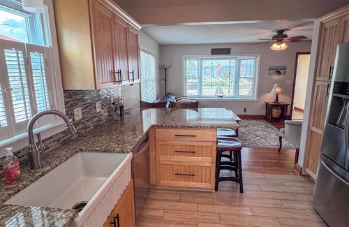 Recently remodeled lake home boasts new kitchen, appliances, furniture, and more. Enjoy the location with incredible views, marina, parks, dining, groceries, boat rentals, shopping, and more within a few minute walk from the front door. The yard and a patio are a great place to grill out, and enjoy the scenery. 100 meg WiFi and desktop computer, cable, and flat screen tvs up and down. This truly is an incredible location to enjoy the lake or all the river valley has to offer.