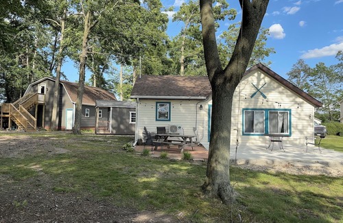 Bring your boat to our lakefront cottage on Little Long Lake in Montgomery MI. The two-bedroom one bath cottage features beautiful views of the lake with all the amenities that you would need for your getaway. Little Long Lake is a 160 acre all sports lake that is divided in half between Indiana and Michigan. Additional sleeping space is included in the fully furnished "she shed" with an additional set of bunk beds. Our 70 ft of lake front offers the perfect location to swim, fish and boat. A perfect area for kids with a sandy bottom and gradual slope. Some non-motorized lake toys are provided and bring your well training companion pet as well.
