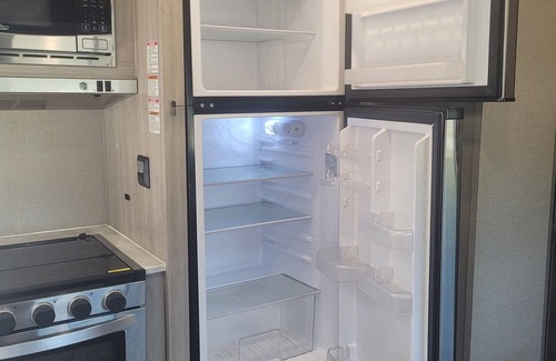 RV includes microwave, oven, fridge, outside grill and basic kitchen utensils