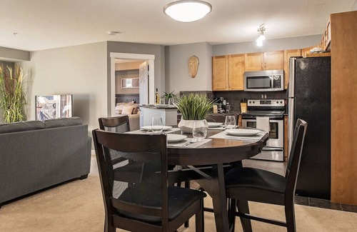 The Living Room is furnished with a loveseat and sofa that has the option to pull out into a queen-sized bed with a memory foam mattress. There is also a 55` flat screen TV with Shaw Blue Curve giving you access to an ample amount of cable channels as well as Netflix and YouTube. Not into TV? No worries. You will find a selection of board games, cards and puzzles located in the entry closet to keep the whole family entertained. The living area also has 2 large balcony windows to let in an ample amount of natural light.