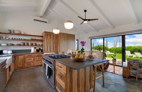 Nestled along the serene shores of Hanalei Bay, Lani Kai, translating to "Heavenly Ocean Home," welcomes guests to its newly refurbished splendor. This spacious four-bedroom, four-bathroom abode caters perfectly to large families or couples seeking ample room to relax and rejuvenate. Recent renovations have infused the home with a touch of Hawaiian elegance, featuring slate floors, chic furnishings inspired by the islands, and rich Koa wood accents adorning every corner, from the bedrooms to the kitchen.