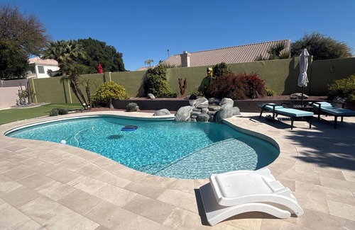 Private Large, conveniently located Guesthouse/Casita with Pool and Bbq area. Located in Mesa near Higley and the 202. This cool property features 1 queen bed one large sectional sofa, large screen, TV kitchenette with sink and mini fridge, bathroom has a steam shower. Laundry service upon request, WiFi, heating, and AC. Guests will find this space Private, pleasant, comfortable, clean and accommodating for their stay. We look forward to welcoming you!
