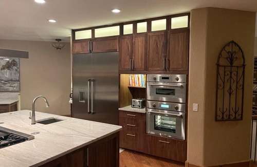 The house has a fully remodeled kitchen ready for making gourmet meals! There is a large refrigerator/freezer, 6 burner stove with a built in griddle, 2 ovens, a steam oven and a microwave/speed oven. Plus 2 dishwashers to make cleanup faster!! The kitchen is also stocked with various sizes of pots, pans, baking dishes, cooking tools, serving dishes and appliances (food processor, blender, 2 crock pots, air fryer)