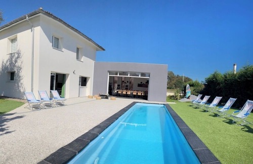 It is the story of a family who lives in this corner of paradise then the children have grown up and it is therefore your turn to discover it. Space, calm with proximity to tourist, sporting, cultural and gastronomic activities. Its heated 12-meter swimming pool on a 1000-meter fenced plot and deckchairs invite you to relax. The 3 living rooms 90m2, Living room with 4 4 seater sofas, 4 poufs, TV, Billiard room / Bar and kitchen / dining room overlook the terrace / swimming pool (4.4m bay window). 2 bedrooms on the ground floor, 5 bedrooms upstairs (one of which is 21 m2, with 6 beds, TV, private bathroom, double indoor / outdoor access by stairs). 6/7 closed parking spaces .