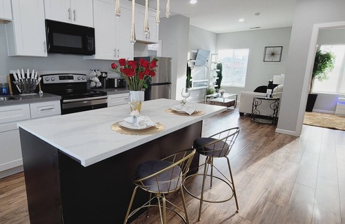 Ahhhh! Come enjoy a lavish experience at this centrally-located luxuriously decorated condo for a "Sex In The City" vibe! This upstairs unit is an open floor plan 1 bedroom 1 bathroom condo. The kitchen is stunning with a custom island, fully stocked kitchen with tons of extras, and coffee station. Relax in the cozy living room on the oversized loveseat, watch a movie or your favorite show on the 55 inch smart TV with Netflix, Hulu and Disney Plus AND a mood setting fireplace. Sun down, wind down! Check out our outdoor patio area with a fire table area while you soak in the joys of the day under the San Diego sky. Ready for bed? This mattress is like sleeping on a cloud!!! The room has a queen size bed, 55 inch Smart TV and mood lighting.