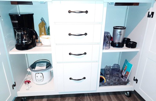 While there's no traditional stove in the suite, you'll still have the ability to prepare simple, delicious meals during your stay. The suite is equipped with a small fridge, electric skillet, BBQ, rice cooker, toaster, Keurig coffee maker, dishes, wine glasses and cutlery or whether you're whipping up breakfast, grilling dinner, or just keeping your local wine chilled, we've got you covered.