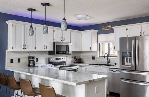 One of the highlights of this condo is the second living area, complete with a pool table, perfect for game nights and extra space to unwind. The other master downstairs has a king bed, flatscreen TV, electric fireplace and en suite bathroom, that also opens into the hall.