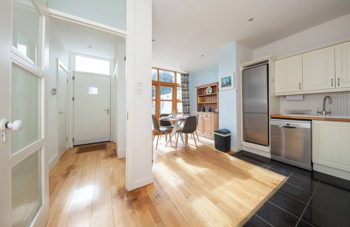 Galley kitchen stocked with oven, hob, fridge-freezer, dishwasher, cookware and basic spices. French doors open straight to the patio for alfresco breakfasts.