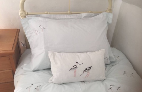 The winding and steep stairs lead to the first bedroom which has a king sized bed with a Vi-Spring pocket sprung mattress, bedside tables and a cupboard wardrobe. High quality crisp white egyptian cotton bed linen is provided. The attractive bathroom with semi-vaulted ceiling and free standing deep roll top bath with a hand-held shower attachment a traditional style w.c. and a hand basin. Fluffy white Christy towels and dressing gowns are provided together with Moulton Brown toiletries. The 2nd bedroom leads directly off the first bedroom, and has twin single beds with Sophie Allport coastal birds linen. The mattresses are high quality pocket sprung. There is a small wardrobe with 2 drawers and bedside tables.