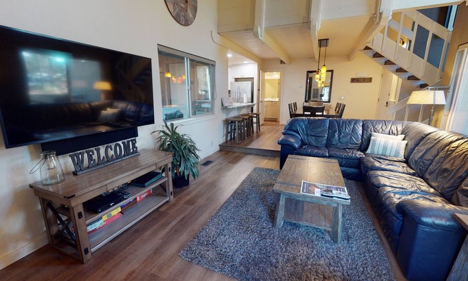 Just steps from The Spa at Sunriver Resort, 32 Tennis Village is the perfect basecamp for exploring Sunriver and beyond. This 1,580 sq. ft. home is enjoyable for up to 6 guests with its 2 bedrooms and 2 bathrooms. Inside this lodge-style condo you will find spacious kitchen, living, and dining areas with vaulted ceilings, wood paneling, and beam accents.
