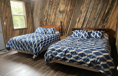 Dry one room cabin with 2 queen beds that can comfortably sleep 4 people. Located inside the cabin you will find a tv, full size refrigerator, microwave, and coffee maker. This cabin has a beautiful deck with patio table and is within a short walking distance to the pond Amenities located on site but NOT inside the cabin include: public restroom, shower house, laundry, shelter house, fire pit, BBQ grills and a stocked pond with ducks to watch & feed.