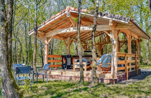 In a fantastic location in the middle of an idyllic landscape, this cozy wooden chalet welcomes you. Spend a lovely vacation here in Queyrac for two. Here you can relax to your heart's content in a homely setting and after active days in nature, swing the wooden spoon together in the kitchen. Also enjoy wonderful hours outdoors, where a rustic terrace with lounge furniture invites you to barbecue together, here you are very close to nature. Enjoy the sun and pleasant refreshment at the shared pool.