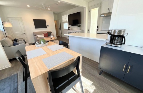 This newly furnished Casita is in a quiet community of Harmony Grove Village. There are no neighbors directly next to the Casita or across. The open living space boasts plenty of windows, full-size Bosch dishwasher and refrigerator, electric cook top and combo microwave and oven, fully stocked kitchen, coffee bar and ample cabinet space. Both bathrooms have quartz countertops and tub/shower combo. There is an abundance of storage in the 2 walk-in closets and hall closet. Watch tv in your king size bed or put your feet up in front of the 72” tv. Bedrooms and bath are stocked with ample linens. The smart tvs have Amazon Prime and are ready for your own streaming subscriptions. Enjoy an evening sunset on the Casita patio, complete with a BBQ, dining area, sofa and fire pit. There is a private entrance to a full size shared laundry room. The ultra quiet heating/air system has 1 thermostat control in the main living space and an additional one in the bedroom. Laminate wood plank flooring throughout. The Casita is equipped with everything you need for a wonderful day at the beach or the pool.