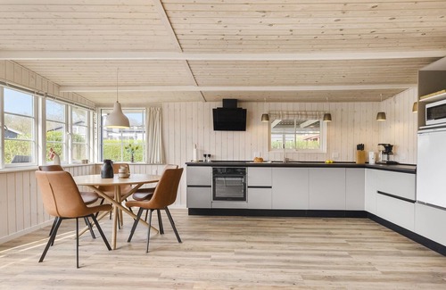 Welcome to this high-quality holiday home, which invites you to enjoy wonderful days by the sea just a few steps from the long sandy beach. The bright, open-plan living area impresses with its simple elegance and invites you to spend cosy hours in a friendly and tasteful ambience. Prepare culinary highlights and take a seat at the stylish dining table. After a long day in the soothing sea breeze, you can relax with a film or spend time together on a cosy games evening.