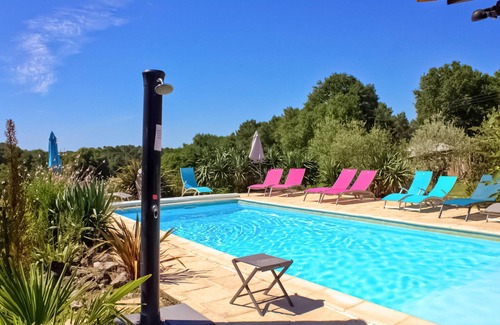 Charming stone house with shared outdoor pool in a rural setting.