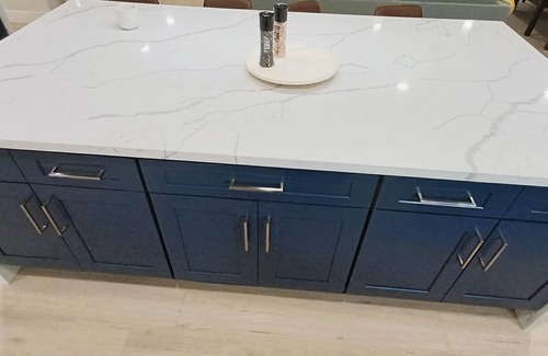 This well-equipped, eat-in kitchen has been newly upgraded and comes equipped with stainless steel appliances, a gas oven, quartz countertops, a large center island, white cabinetry, decorative pendant lighting, and much more