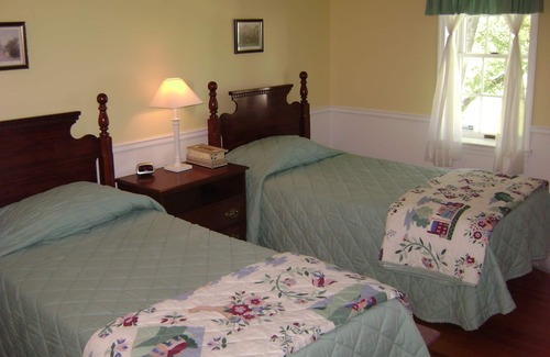 Bedrooms: The West Wing Suite: Main level. Large bedroom, siting area, TV, kitchenette, full bath, two large walk-in closets. Bay window, deck with spectacular view, overlooking the Spring House and pond. Two queen beds.
