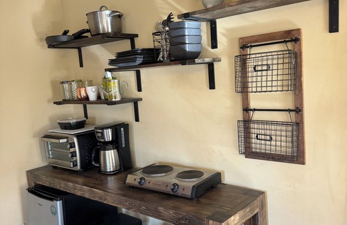 Kitchenette: This kitchenette has a mini refrigerator/freezer, countertop that doubles as an eating space, coffee maker, toaster-oven, 2-burner hot-plate, cutting board, cookware, dishes, utensils, 4 stools, paper towels, hand soap, and a trash basket. You will find coffee, creamer, and sugar to get you started in the morning.