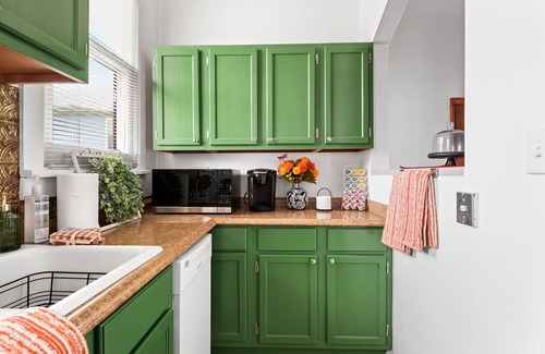 With a great view from the 2nd floor through 8' bay windows, the Fats Domino Suite has a private full kitchen, 2 bathrooms (1 clawfoot tub/shower & 1 shower), (3) Smart-TVs, central air/heat, ceiling fans, living room, dining room. Only the entrance foyer on the 1st floor and the 2nd floor laundry room spaces are shared with other guests. The suite is completely private for you and your additional family members or guests.