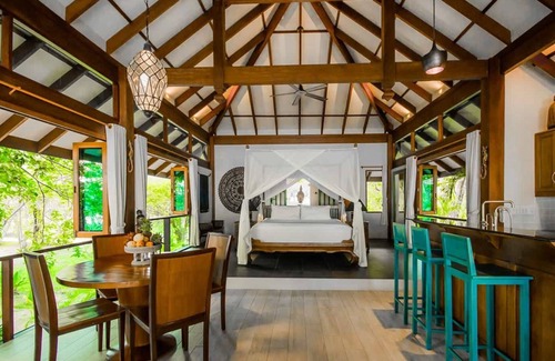 It's spacious, bright, open-plan style studio design with raised level sleeping area has a wonderful four poster King size bed, en-suite bathroom with with an open-air double balinese style rain-shower and a "his and her" vanity counter.