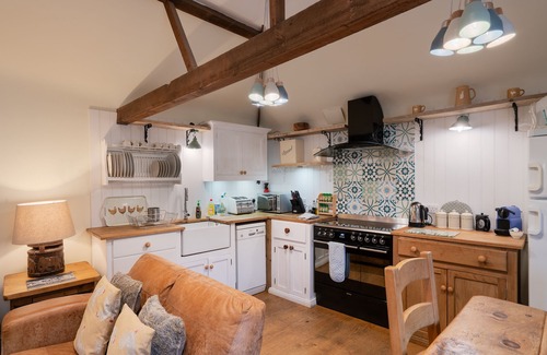 The Cottage features a large, open-plan living, dining and kitchen area with a farmhouse dining table seating four as standard (more with ease) and chunky wooden English furniture throughout.
