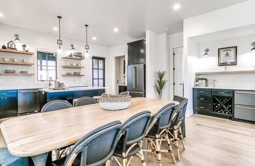 Inside, the open floor plan joins the kitchen, dining area and living room, so your group can gather all together. A gorgeous living room bar with cooled beverage drawers and a built in fire place are unique features that make this living area stand out. The state of the art kitchen is fully stocked with dishes and cookware and the custom dining table comfortably seats 10 people. A record player enhances the ambiance in this entertainer's dream space!