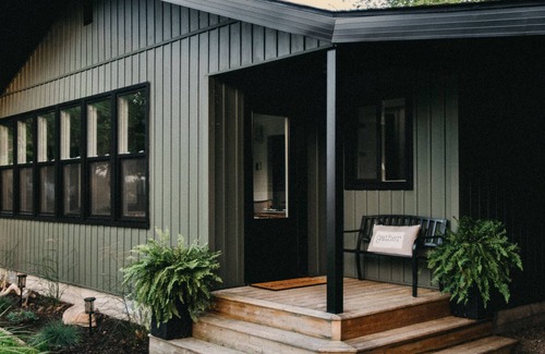 From the quiet road, you can’t miss it, as the cottage's all- green exterior and large black windows contrast its beautiful calming treed surroundings.
