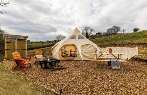 Welcome to Bath's top glamping with Lotus Belle ‘Star Gazing’ Tents. Spacious heated tents for comfort. Private hot shower and toilet. BBQ, fire pit, picnic table with scenic views. Battery and solar-powered outlets. Set on six acres of orchards and wildlife. We have two floor mattresses available for under 12s. If you wish to bring any other guests above this age please book another tent.
