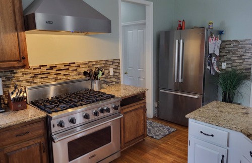 Master BR features vaulted ceilings, new king bed, sitting room, large bathroom, and jacuzzi tub. 3 other BRs all feature new Beautyrest Queen beds (crib available). 5th pullout bed in finished basement with its own 1/2 bath. If needed, we can rearrange furniture to accommodate 1st floor bedroom in office next to 1/2 bath ($200 fee for the stay). However there's no shower on the 1st floor.