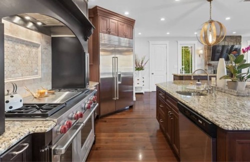 Fully stocked kitchen with Wolf stove, Sub-Zero fridge and two dishwashers.