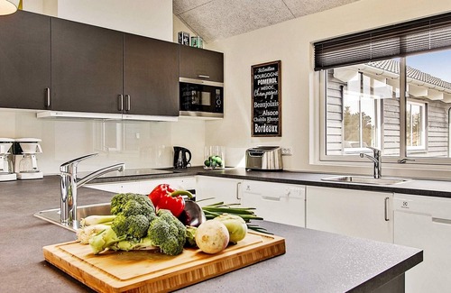 A well-arranged holiday cottage with a swimming pool section and activity room located in Blåvand. It has everything you need for your holiday. The impressive pool section has a 18 m² large pool with a water slide and counter-current system, lovely whirlpool for 4-6 people and a large sauna. The house is highly spacious and well-dimensioned, with 2 separate sleeping sections with bathrooms. There is also a large mezzanine, popular for children. The natural gathering spot is the large and architect designed combined living room and kitchen. The kitchen is well-arranged and has room for several chefs at the same time. There are 2 ovens, to fridge-freezers plus an extra fridge at the bar, 2 dish washers, 2 coffee machines and a large cooker (induction). The dryer is also placed in the kitchen. The living room is tastefully arranged with comfortable furniture and a wood-burning stove as well as a 65'' flatscreen TV. On the other side of the living room you find the large activity room with a bar, dart and a pool table. There is also Apple TV and 55" Smart TV as well as access to Google Chromecast. PlayStation4 available (bring your own games). There is a large terrace (partly covered) where you can enjoy the Danish summer and comfortable furniture. Here you will find an outdoor kitchen with a wash basin for cleaning fish and then preparing them on the gas grill. There are swings and sandbox for children. The house is opposite Denmark's largest mini-golf facilities and only a short walk from a charming town with good restaurants and shops. Payment for consumption, and deposit must be paid in cash to the landlord at the house. No letting to youth groups.