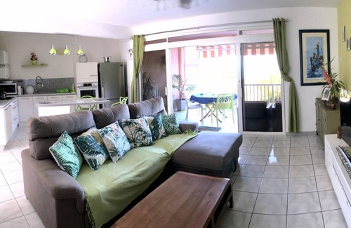 Our spacious F2 bis apartment of 75m2, with a large living terrace facing the lagoon, is equipped with all modern conveniences (free Wi-Fi, smart TV, high-tech fan air conditioning) and elegant and refined furnishings to offer you a pleasant stay. The rooms are very comfortable, suitable for couples, families or friends, and the kitchen is fully equipped (induction hob, oven, microwave, kitchen hood, refrigerator, freezer, coffee machine, kitchen utensils, dishes, etc.). Open to the living room, it offers a friendly setting to cook your delicious meals while enjoying the ocean view.
