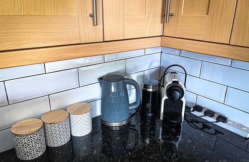 - Kitchen with: 5 ring induction hob, mini oven, microwave, fridge, Krupps Nespresso Coffee Maker with pods, Nespresso Frother and breakfast bar. All crockery, glass-wear and utensils