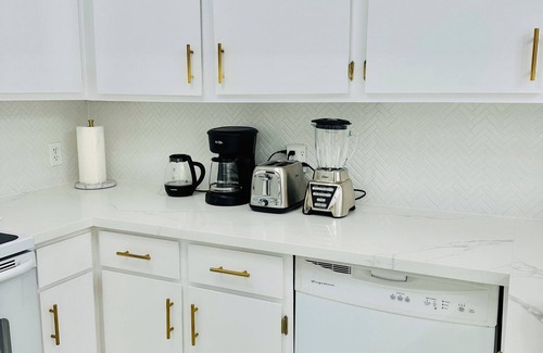 The renovated kitchen features sleek quartz countertops, gold hardware, and an eye-catching mosaic backsplash. It’s fully stocked for all your cooking and dining needs, complete with a coffee pot, blender, kettle, toaster, stainless steel pots and pans, assorted cookware, as well as plates, cups, spoons, and forks. Whether you’re preparing a quick breakfast or hosting a full dinner, you’ll have everything you need right at your fingertips.