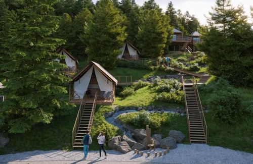 Kötschach-Mauten: Car free modern resort "Chalets/Glamping Nassfeld by AlpsR.", 700 m a.s.l.. 500 m from the centre, in a sunny position on a slope, directly by the skiing area. For shared use: children's playground. In the complex: reception, kiosk. Parking. E-charging station. Supermarket 850 m. Golf course (18 hole) 20 km, skisport facilities, ski rental 200 m. Well-known ski regions can easily be reached: Nassfeld 25 km. Well-known lakes can easily be reached: Pressegger See. Hiking paths: Nassfeld-Pressegger See. The holiday properties may differ in living space, floorplan, equipment and furnishing.
