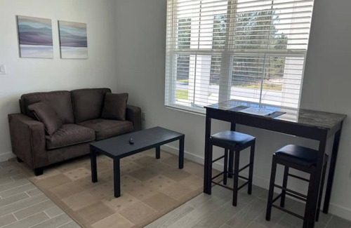 This private entrance suite sits in a new-construction home with a street view & outdoor covered seating area. Equipped with a private bathroom, bedroom with blackout curtains for a good knight sleep & closet. Kitchenette with a mini fridge, microwave, Keurig, Air Fryer, dining table & coffee table. For those who prefer to prepare their own food you will find plenty of pots, pans, cups, plates, & silverware. The studio area provides a love seat & Roku tv where you can log in to your streaming accounts. The bedroom provides a queen size bed & closet, ceiling fan in bedroom. The water in the entire home is filtrated & safe to drink from the faucet, there are complimentary water bottles, soft drinks & snacks.