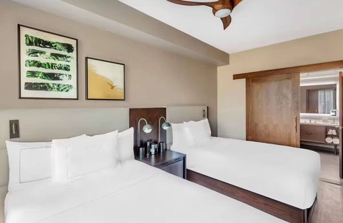 This two-bedroom, two-bathroom suite offers a 138 square-foot lanai area as well as a balcony with seating for four. The primary bedroom features a king-size bed, 55-inch TV and desk. The primary bathroom includes a vanity with a single sink, a backlit make-up mirror, a wall-mounted rain shower head. The toilet is in a separate room and has a heated washlet that is fully covered. The second bedroom is furnished with two full-XL size beds and a 65-inch TV. The second bathroom includes a single-sink vanity and toilet and a walk-in shower with a wall-mounted rain shower head. The suite includes a living room with a queen sofa bed, 65-inch TV and dining table for six and charging station at the entrance. This suite also features a full kitchen with sink and waste disposer, dishwasher, full-size refrigerator with freezer and ice maker, electric range with oven, built-in microwave and washer/dryer unit, fully furnished balconies from which to enjoy the cool ocean breezes and more!