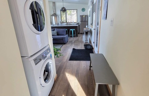The living room features three large sliding windows, opening onto the deck, and facing west with views of the mountains. The fully equipped kitchen has a dishwasher, microwave, refrigerator, coffee maker, crockpot, waffle iron, and range/oven. The large kitchen island with four stools is a great place to gather. In addition there is a fold out dining table with stools that can be set up to seat 6. There is a stacked washing machine and dryer in the corridor alcove.
