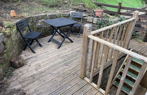 The living areas in this terraced, three-storey cottage include a kitchen with electric oven and hob, microwave, and fridge with ice box, and a living/dining room with a TV and gas fire. Two bedrooms include a king-size and a second-floor zip/link twin, along with a shower room. To the rear is a garden with a raised decking area with furniture, whilst roadside parking on a first-come, first-served basis can be found nearby. Within 0.2 miles, there is a shop, and within 0.1 miles, a pub. Two well-behaved dogs are welcome. Please note that smoking is not allowed. WiFi, fuel, power, bed linen and towels are all included in the price. Note: The first part of both staircases has no banister and are narrow and steep. There are sloped ceilings and exposed beams in the second-floor bedroom with limited head height. There are steps up to the raised decking without a banister. Enjoy the picturesque countryside surrounding Hebden Bridge from the historic setting of Meg's Den.