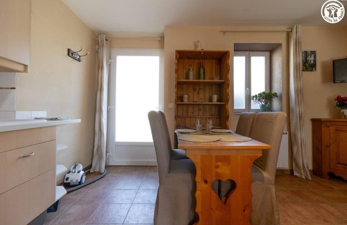 Chateau comprising 3 adjoining gîtes located in a renovated wing. Access via an external passageway. Gîte on 2 levels (ground floor + 1st floor): living room-kitchen lounge area (1 sofa bed for 2 people 140x190 cm), 1 mezzanine bedroom opening onto the living room (1 double bed 140x190 cm), shower room (walk-in shower with WC). Shared grounds + private terrace. Shared parking for the 3 gîtes 80 m away with the possibility of unloading the car in front of the gîtes. Ski Le Granier 25km, La Féclaz 31km. Lake 10km. Swimming pool 4km. Thermal baths Challes-les-Eaux 12km. Golf Apremont 14km. A 13th-century Templar castle steeped in history, nestled in the countryside and nature, 18 km from Chambéry and 25 km from the slopes. Very comfortable. Contemporary style. Warm and cozy. Large, exposed terrace. Vast shared natural grounds. Very peaceful. Beautiful panoramic views of the surrounding countryside.