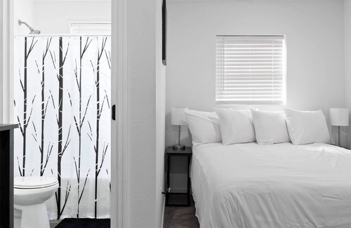 Guests will enter the home with a digital door code. Once inside, you'll be greeted by the spacious and bright living room where you'll find a queen sleeper sofa, large TV and dinette table. Just around the corner of the front door is the fully-equipped kitchen, which features a full-size refrigerator, oven, cooktop and microwave! The bedroom is straight ahead where you'll find a queen bed and the full bathroom is on your left! There is a charcoal grill available in the back of the house.