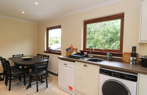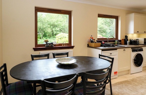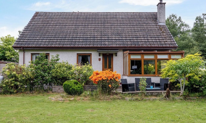 Amenities: Oil central heating. Electric oven and hob, fridge/freezer, washing machine, dishwasher, air fryer, slow cooker, microwave, kettle and toaster. Smart TV. Fuel and power inc. in rent. Bed linen and towels inc. in rent. Highchair, travel cot and stairgate available. Iron and ironing board. Ample off-road parking. Gardens to rear with lawns, patio area and patio furniture and summerhouse/games room. One well-behaved dog welcome. Sorry, no smoking. Shop 3.5 miles, pub 0.1 miles. Note: There is a good housekeeping bond of £350. Note: Train tracks for the Caledonian Sleeper train along the bottom of the garden do not cross the boundary. Note: There are a few steps up to the entrance of the property so please bear this in mind when booking