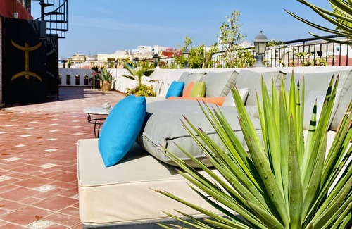 Large roof terrace with incredible panoramic view of the ocean and these waves, the Atlas Mountains and the Aourir Valley.