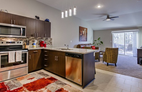 * Kitchen has all new stainless steel appliances. Includes dishwasher, double sink (garbage disposal), electric stove, microwave, & refrigerator/freezer with ice maker. Basic kitchen items provided including single cup coffee maker, plates, bowls, cups, silverware, & cookware. The open kitchen/living room layout allows you to enjoy your meals at the kitchen island, watch tv, & entertain.