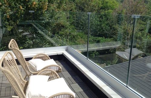 Beautiful, modern house with 5 bedrooms, hot tub, 4 poster bed, freestanding copper bath and great views, walking distance to blue flag beach and local pubs and restaurants. The main bedroom has a private ensuite and the second twin/childrens room also has en suite bathroom. These are both situated on the main floor, with the further 3 bedrooms and family bathroom downstairs. Open plan living area and terrace to enjoy the views. Put up outdoor pool, and play area. Open plan living/dining kitchen. Car parking. Stunning views across the Glen and to sheerness docks. There is an 80 m square sun terrace un the upper floor leading to the hot tub with outdoor seating and dining area. This area is fully exclusive to guests.