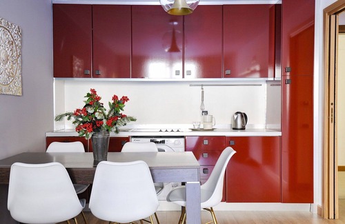 The apartment opens onto a nice day area, offering ample views of the reception's small garden and comprises a fully-equipped open kitchen (with induction cooktop, fridge, microwave, washing machine and dishwasher), a dining area with a wooden table with 5 chairs, and a relaxation corner featuring a comfortable double sofa bed, a pouf, a coffee table, a TV set and some shelves.