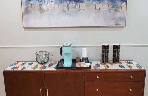 The fully-equipped features solid surface counter tops, new stainless steel appliances, coffee bar/buffet, and all the necessary tools for preparing delicious meals.