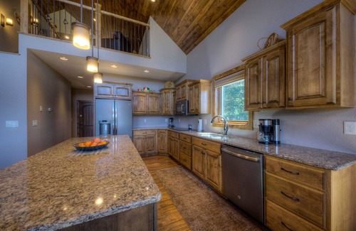 Guests will find a covered, semi-private lower-level patio and hot tub area. The large upper deck has an oversized patio table and built-in natural gas grill with granite countertops. Four bedrooms with king-size beds and cable TVs plus four additional twin-size beds. The dining table can seat up to 12 plus four on the island. The fully equipped kitchen includes a Keurig and Bunn coffee makers, a beverage fridge adjacent to the patio as well as two ice makers in the refrigerator.