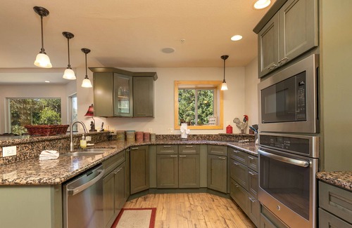 The kitchen features large granite counters, stainless-steel appliances, a wine fridge, and all the gear you’ll need to keep everyone happy and fed during your extended stay. There’s seating for six at the dining table and four at the counter. Just outside, the views are even better from the large deck with an outdoor dining table, lounge chairs, a gas fireplace, and a gas grill.