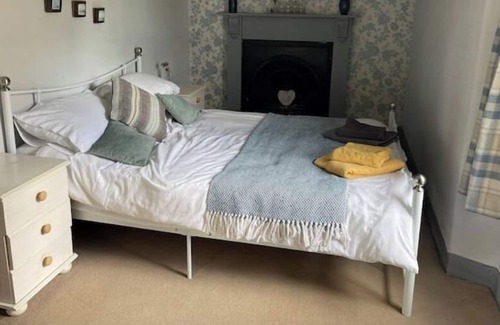 Downstairs is a lounge with open fire, smart TV and DVD player, Alexia, dining table; a small kitchen with freestanding cooker, fridge, microwave, kettle, coffee maker, toaster, slow cooker, sandwich maker, iron and ironing board; the bathroom has a shower over the bath; the downstairs bedroom has a kingsize bed and a sofa as well as a TV.